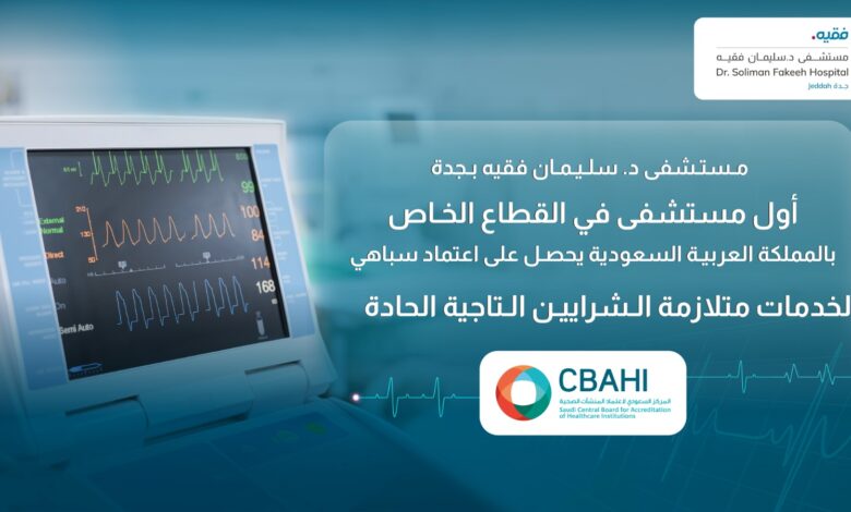أعلن مستشفى د. سليمان فقيه بجدة عن حصوله على اعتماد المركز السعودي لاعتماد المنشآت الصحية (سباهي (CBAHI – لخدمات متلازمة الشرايين التاجية الحادة (ACS)، ليصبح بذلك أول مستشفى خاص في المملكة العربية السعودية يحصل على هذا الاعتماد المرموق.