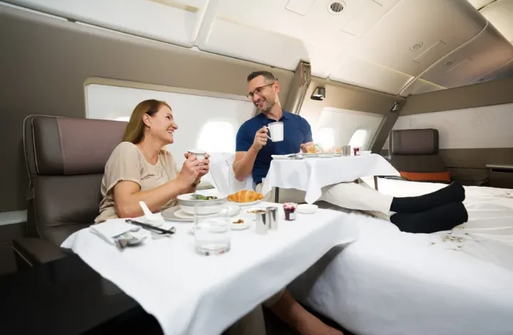 التصميم الأوسع يتيح مقاعد مسطحة بالكامل في درجة رجال الأعمال، مع وصول مباشر للممر، ومساحات تخزين واسعة وأنظمة ترفيه محسنة أثناء الرحلة. Business Class | A380 | Singapore Airlines