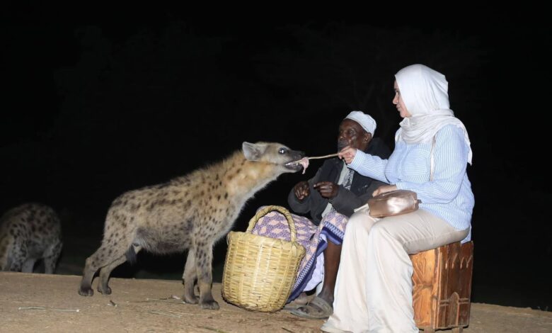 في واحدة من أغرب الظواهر العالمية تتجلى في هرر علاقة سحرية بين الإنسان والحيوان؛ فعند الليل ينادي رجل الضباع على هذه المفترسات بأسمائها عند أسوار المدينة ليطعمها اللحم بيده .