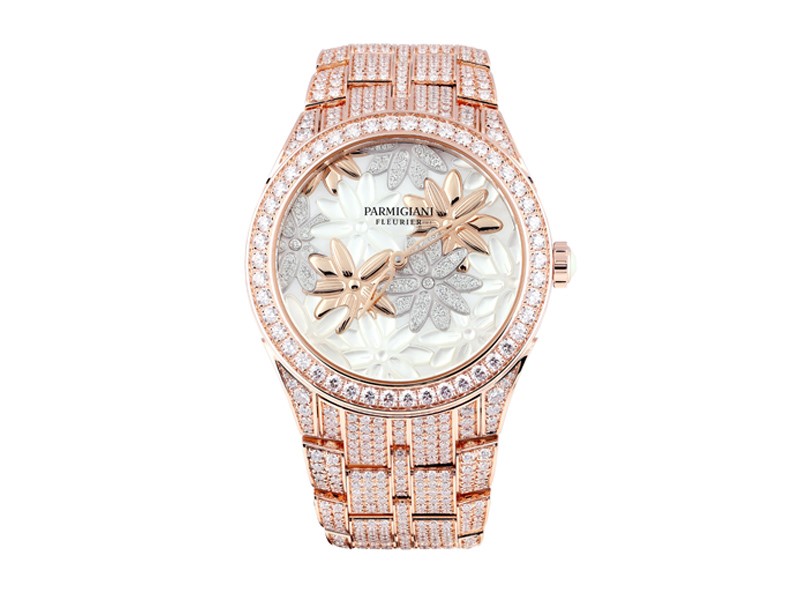 تم ترصيع الطارة، العروات، والسوار بالماس بشكل كامل بأحجار F-Gnear وVVS عديمة اللون، الخالية من العيوب الداخلية، والتي يندر رؤيتها في صناعة الساعات. تأتي العلبة المصنوعة من الذهب الوردي بقطر 36 مللم بتاج مع كابوشون أوبال أبيض؛ علبة مصقولة ومرصعة بـ 70 ماسة تزن 2.09 قيراط، بينما تم ترصيع السوار بدقة بـ 906 ماسة وزنها 9.22 قيراط. تم دمج السوار بشكل جميل في العلبة بفضل العروات التي تأتي على شكل دمعة، وهي من علامات برميجياني فلورييه المسجلة، وتم تصميمها بعناية لضمان الراحة المطلقة.