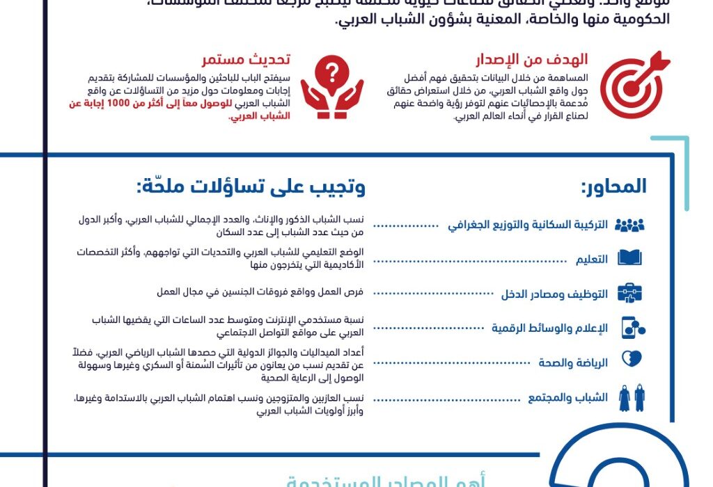 ويجيب الإصدار الجديد المنشور على موقع المركز الإلكتروني ومنصاته الرقمية على 100 سؤال محوري يهم الشباب العربي وكافة المؤسسات العاملة مع الشباب، وذلك بتحديد أبرز توجهات الشباب العربي وفق الحقائق المبنية على الأبحاث، وتوفير بيانات ومعلومات موثوقة لصناع القرار في العالم العربي لتطوير برامج وسياسات تمكين الشباب.