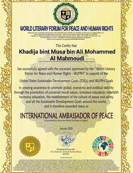 حصلت الإعلامية المميزة خديجة المحمودي على لقب سفيرة السلام الدولي من المنتدى الادبي العالمي للسلام وحقوق الانسان، جاء منح هذه الشهادة واللقب بسبب مشاركتها بالإعمال التطوعية أثناء عام ٢٠٢٠.