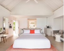 بالإضافة إلى ذلك، تشمل كل فيلا غرفة نوم رئيسية مطلة على المحيط ليبدأ الضيوف نهارهم بإطلالاتٍ تحبس الأنفاس. وتتميز هذه الغرف بالألوان التي يشتهر بها المنتجع، فيطغى عليها اللون الأبيض الدافئ لتعكس أقصى قدرٍ ممكنٍ من نور الشمس الطبيعي. ويجمع التصميم الداخلي ما بين الطابع الأنيق والأسلوب البسيط، ويشتمل على ألوان هادئة ومواد طبيعية تندمج مع البيئة المحيطة بها.